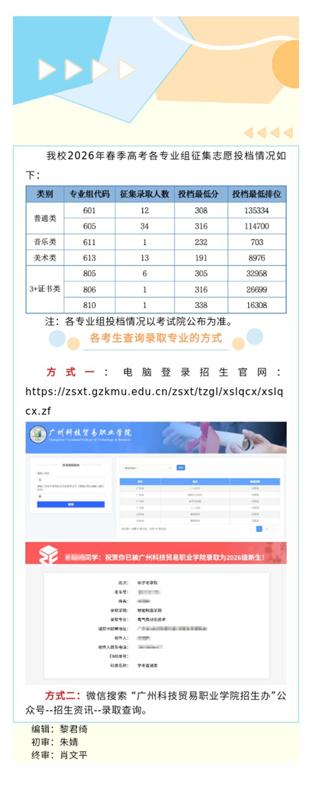 征集投档│2026年广州科技贸易职业学院春季高考征集志愿投档情况
