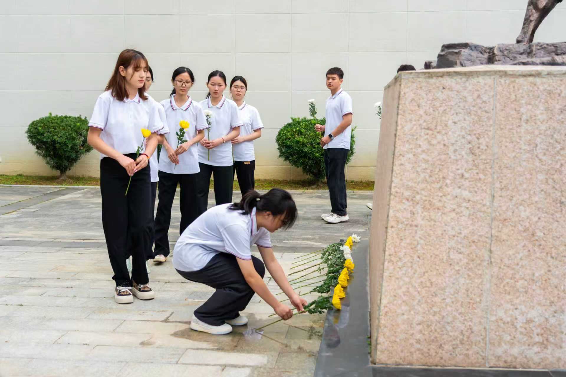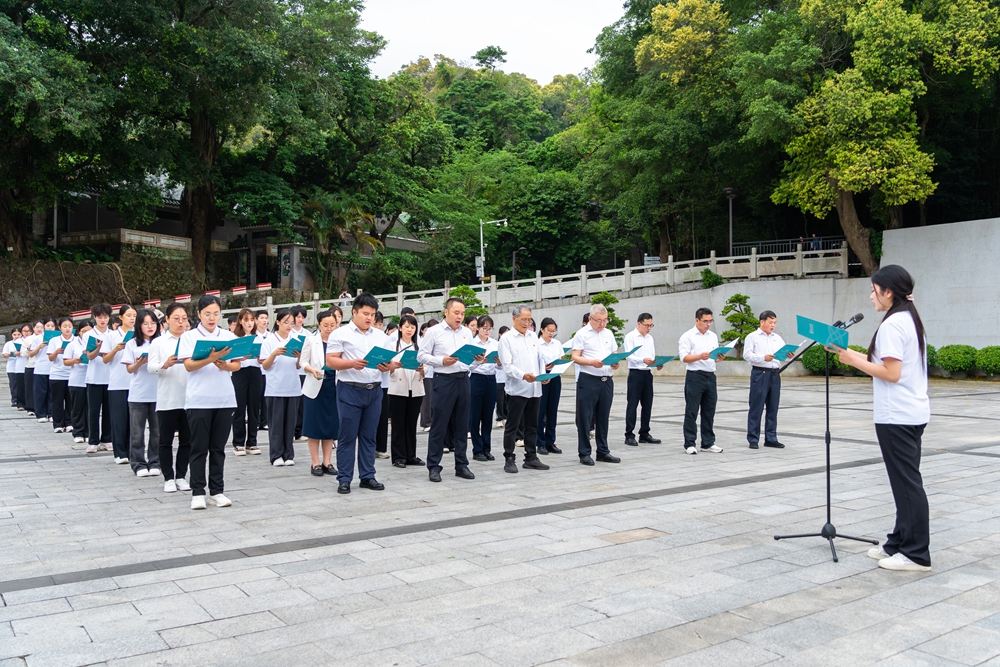 “在岭南的版图上,有一把锋利的宝剑,它刺破了旧时代的黑暗……”全体人员齐声诵读红色诗歌《英雄剑——写给东江纵队》。铿锵的诗句在纪念馆前回荡,寄托着新时代青年对革命先烈的无限追思和崇高敬意。随后,全体人员肃立默哀,师生代表依次上前敬献鲜花,表达对英烈的深切缅怀。