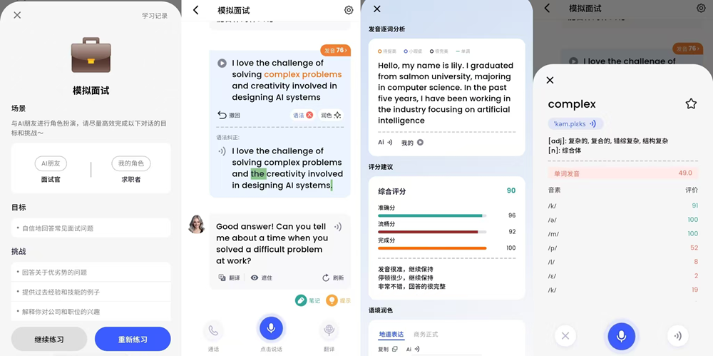 技术层面,注重发音细节:它搭载了和中高考英语口语考试同源的语音识别引擎,能够实现音素级纠音。针对中国学习者容易混淆的发音(像/θ/与/s/),它会生成发音示意图和对比波形图,助力用户直观了解发音差异。部分用户反馈,坚持使用一段时间后,发音清晰度有所提高。
