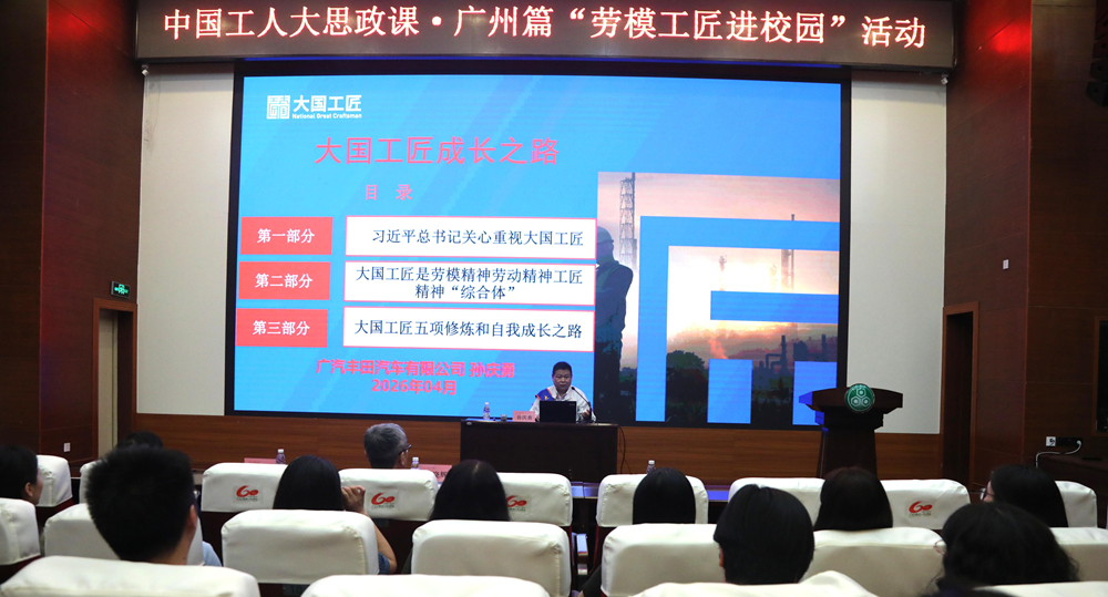 “劳模工匠进校园”主题宣讲会在从化校区101报告厅举行。孙庆勇作为主讲嘉宾,以“大国工匠成长之路”为主题,结合自身深耕汽车制造领域多年的奋斗积淀,将习近平总书记对大国工匠群体的深切关怀与高度重视、劳模精神劳动精神工匠精神的深刻内涵,以及大国工匠五项修炼的核心要义与成长路径,融入自身从一线技术工人中淬炼为“大国工匠”的坚守与突破之中,为青年学子带来一场兼具温度与深度的精神滋养。他以朴实真挚的话语,讲述着岗位上攻坚克难的执着坚守、技术创新中精益求精的不懈追求,用一个个鲜活生动的实践故事,生动诠释“干一行、爱一行、专一行、精一行”的职业真谛,为青年学子树立起看得见、够得着的职业榜样,激励青年一代在勤学苦练中锤炼本领,在追求卓越中践行初心。