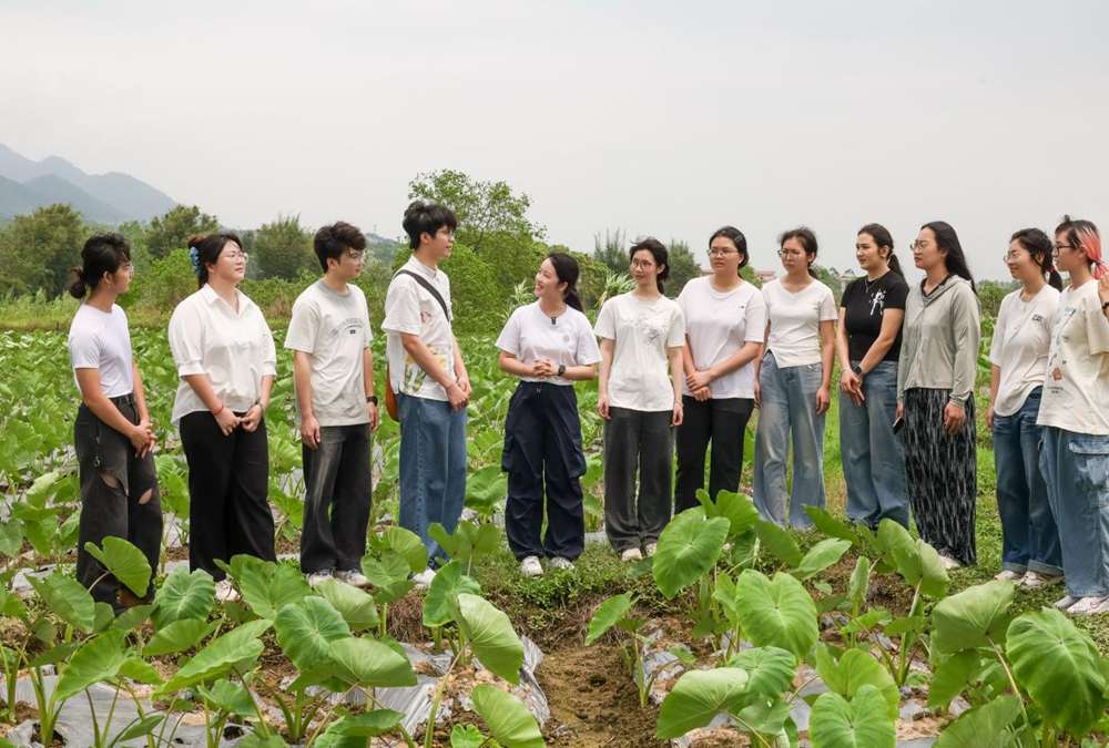 在连片的芋头田埂间,宣讲团师生们以土地为席、以发展实景为课本,亲身感受在“百千万工程”推动下乡村面貌的切实变化与发展活力。青年师生宣讲团成员罗俊芬老师从广外青年奔赴甘肃民勤沙漠种植梭梭苗的亲身经历讲起,和在场师生聊起乡村振兴的真实图景,聊起青年一代在时代浪潮中的使命与选择。