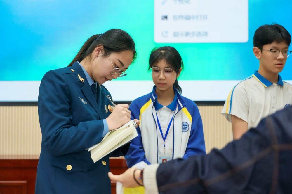 互动环节中,同学们纷纷从后排冲到台前,围着学长学姐追问成长困惑,从女生参军的准备事项,到外语基础薄弱能否参与国际志愿服务,宣讲团成员以真诚的解答一一回应,在双向对话中让榜样的力量真正走进青少年心底,实现了思政宣讲从“入耳”到“入脑入心”的转变。