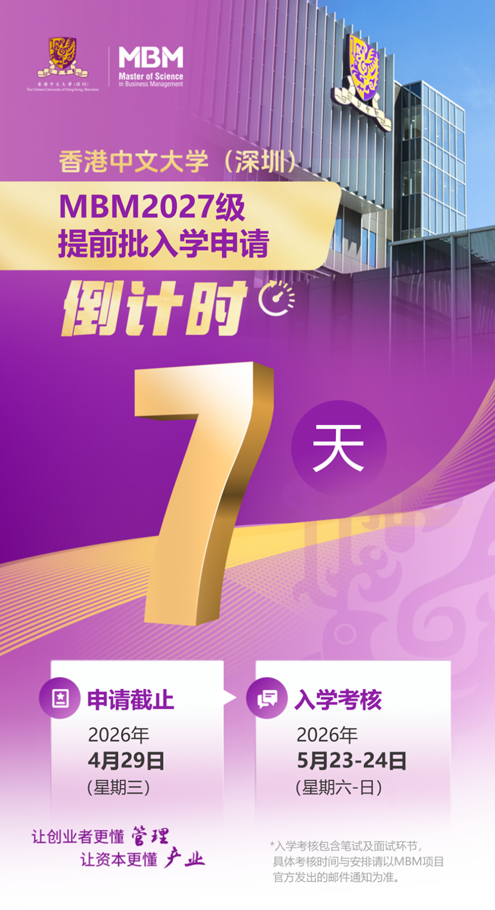 倒计时7天!香港中文大学(深圳)管理学理学硕士MBM2027级提前批次申请,将于2026年4月29日(星期三)24:00截止!MBM采用滚动制招生录取,材料完整详实者将优先获得入学考核邀请。欢迎同学们尽早准备,早日锁定机会。
