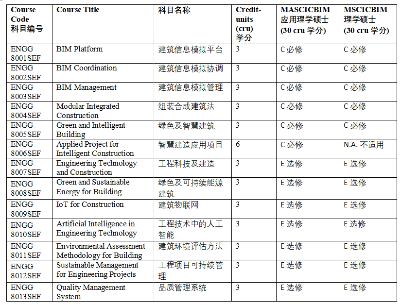 Website 课程网址: https://www.hkmu.edu.hk/st/sc/programmes/department-of-construction-and-quality-management/masc-msc-in-intelligent-construction-and-building-information-modelling-mascicbim-mscicbim/