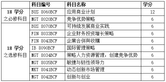 注意:循「途径一」入学的学生, 即獲得认可的工商管理相关领域的硕士学位(或等同资格),必须修毕24学分,其中包括18学分的必修科目以及6学分的选修科目(即一門選修課)。