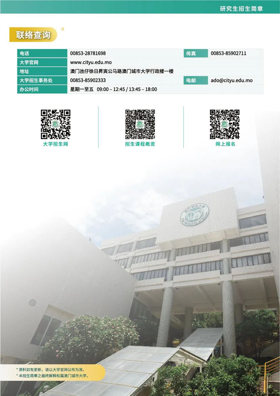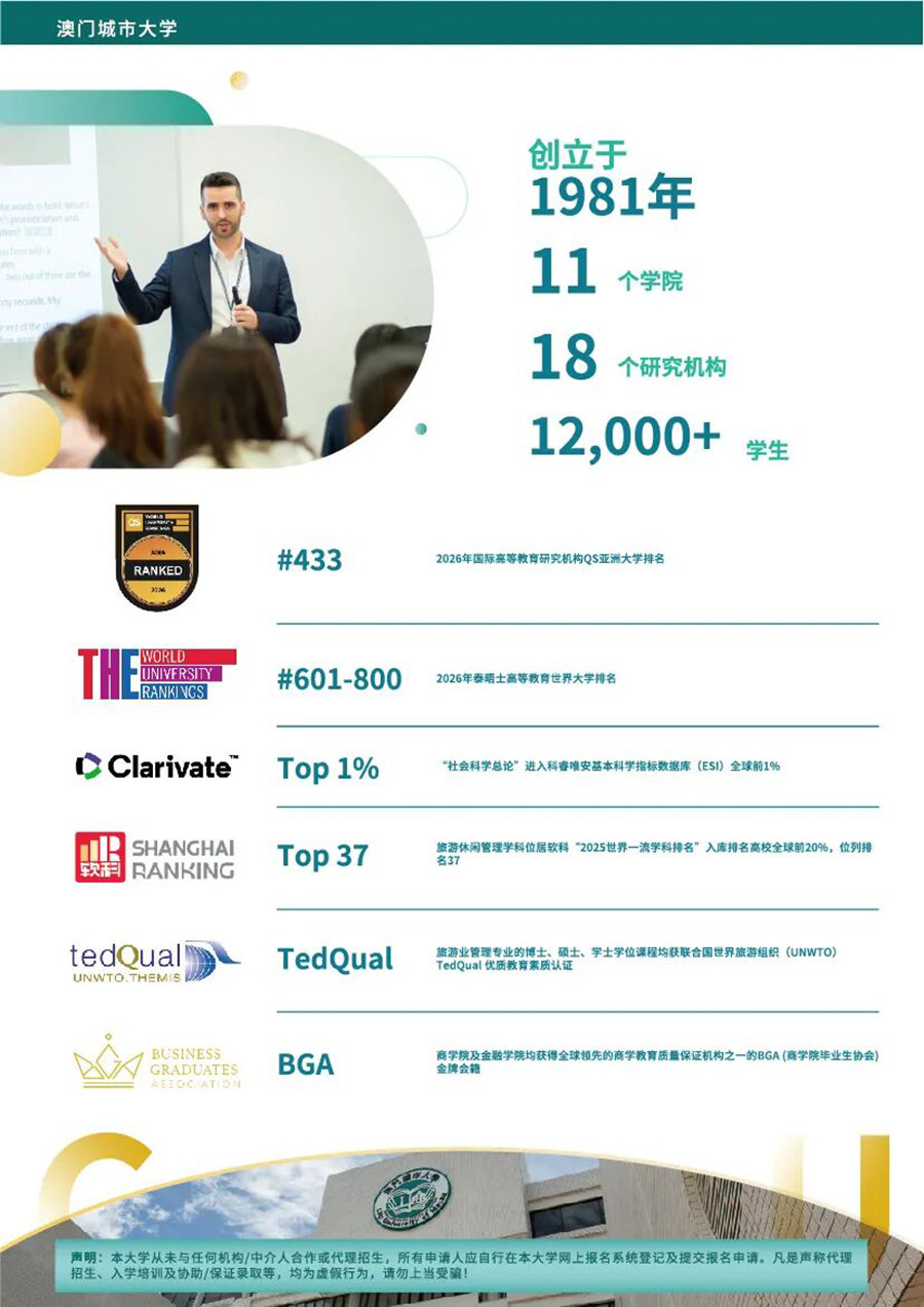 澳門城市大學11個學院招生直播回顧來襲,一次補齊你所有升學疑問!11個學院全面覆蓋文、商、理、工、藝、法、教育等領域,無論是想走學術科研路,還是想深耕應用型領域,都能找到匹配方向。直播內容包括:大學介紹、學院介紹、課程特色、報考攻略......,你想知道的乾貨都在這裏,幫你一鍵掃清申請障礙!