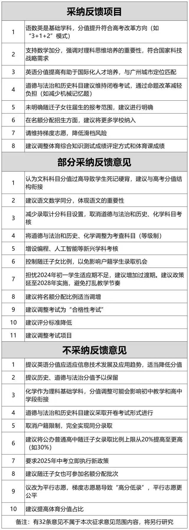 2025年4月25日,广州市教育局发布《关于公开征求中考改革意见结果反馈的公告》,对2025年2月28日至3月29日期间征集的186条公众意见进行集中回应。经梳理合并为9类29项,最终采纳8项、部分采纳11项、不采纳10项,另有32条非相关内容另行处理。