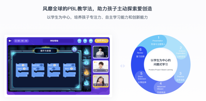 上课方式:在线小班(3-6人)直播,采用PBL项目制教学,适合注重互动体验,学习时间也灵活,注重实践与创新能力培养。