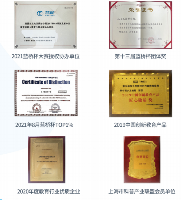 自成立以来,妙小程凭借优质的课程内容、专业的师资服务以及高效有趣的编程学习解决方案,赢得了众多荣誉,包括:中国人工智能学会合作教育企业、上海市科普产业基地重点培育企业、全国青少年软件编程等级考试的指定合作伙伴、第十一届蓝桥杯大赛协办方 ,并荣获 “2020 年度教育行业优质教学企业”、2018 新浪五星金牌在线教育机构等称号。