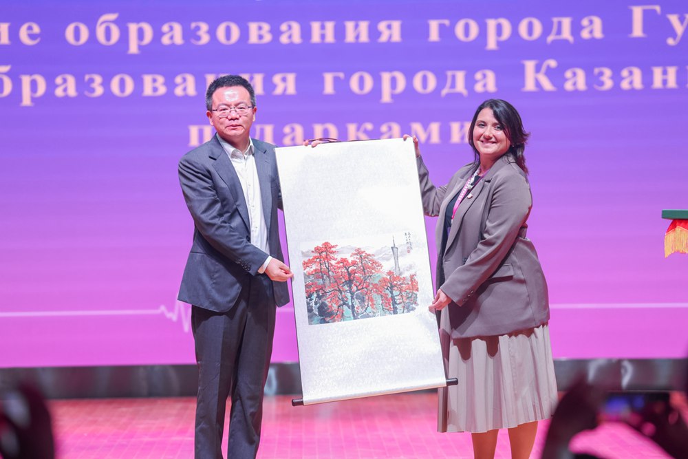 广州市教育局副局长陈学明强调,创新是教育的心跳,融合是时代的强音。喀山市教育局副局长比克托娃期待通过校际合作培养未来创新者。两地教育部门互赠礼物,象征合作情谊。
