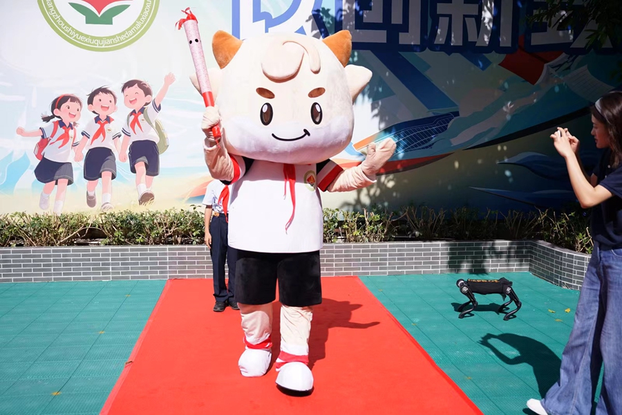 典礼的亮点——“‘童’传火炬”环节精彩纷呈。学生代表以武术、篮球、霹雳舞等多元形式展现体育精神;更引人注目的是,机器狗与机器人共同加入了火炬传递队伍,让科技与体育完美交融。当“建大牛牛”惊喜亮相,现场此起彼伏的掌声和欢呼声将火炬传递带向高潮。当火炬最终传至马颖琳书记手中时,全场齐呼“激情全运会,活力大湾区”,完成了科技赋能全运会,传统与创新、体魄与智慧的共鸣。