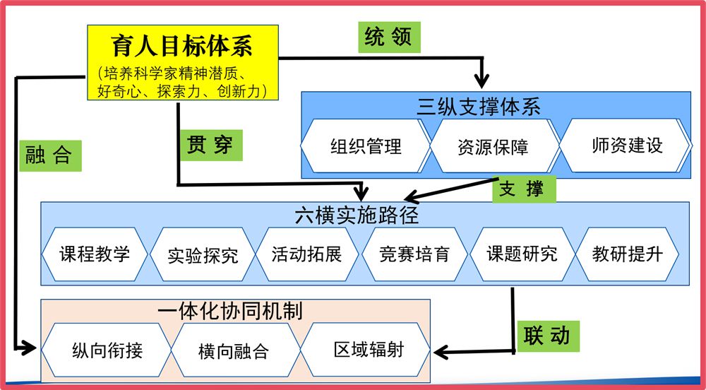 确保所有教学活动和教学环节都紧密围绕培养育人目标来展开,三纵支撑体系是筑牢科学教育的根基,六横实施路径实现多维培养科学素养,一体化协同机制是打通育人的全链条,为学生奠定坚实的科学基础。