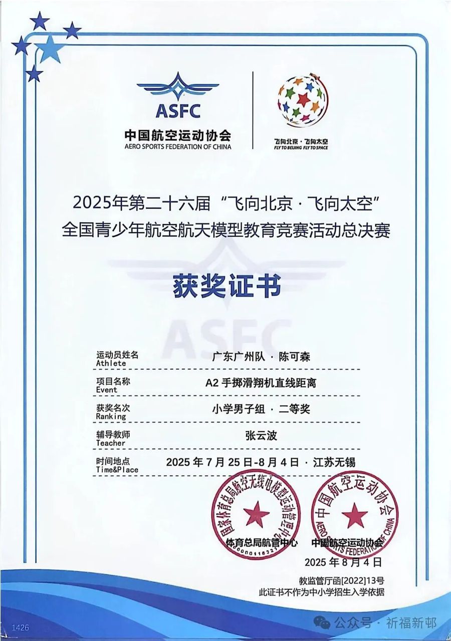 在这场代表国内青少年航模竞技最高水平的巅峰对决中,祈福英语实验小学三位少年卢泽枫、郑其果、陈可森,以凌云之志驭风而行,凭卓越技艺破空而出,斩获多项殊荣,为学校赢得无上荣光,更在祖国航空航天事业的人才培养画卷上,留下了浓墨重彩的一笔!