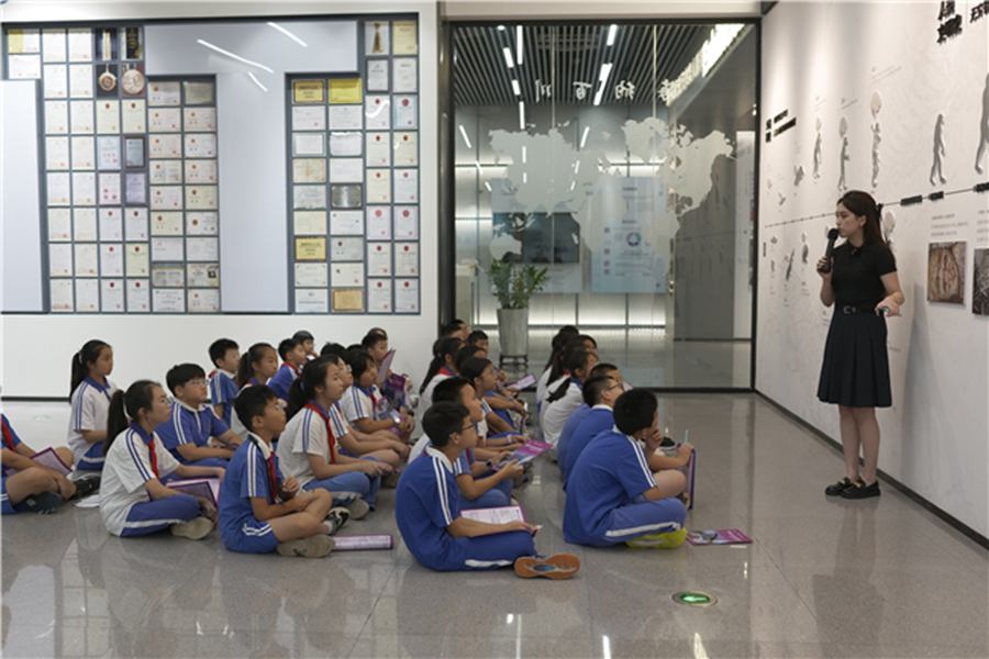 基地讲解员胥匀家老师为同学们生动地讲述了大脑的神奇进化历程。同学们整齐地围坐在一起,听得兴致盎然。