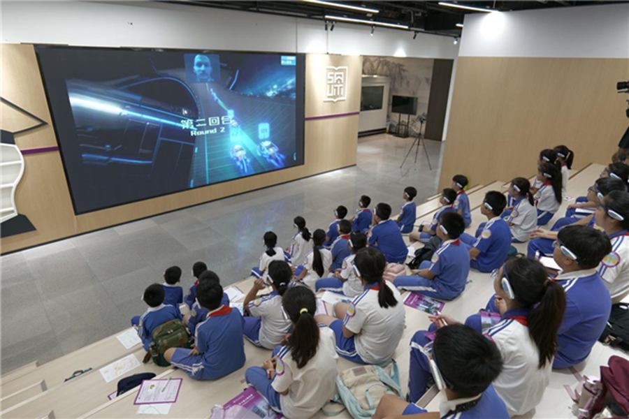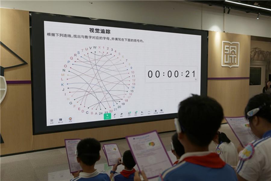倒计时开始! 学生们紧盯屏幕上的连线,脑机设备实时投影的专注力曲线上下跳动。