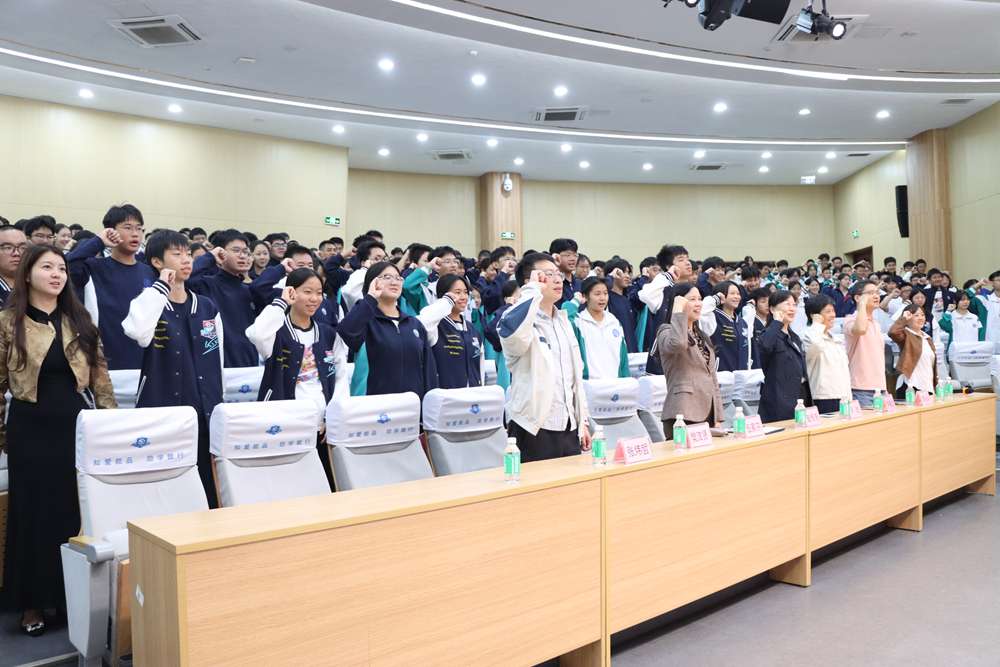 活动特设了震撼人心的宣誓环节。在赵传东老师的引领下,全体师生举起右拳,仿照中国航天员神圣的入队仪式,许下了为梦想与祖国奋斗的铮铮誓言。赵传东老师勉励同学们,要拥有宽广的胸怀、渊博的知识和能力、良好的心理素质和坚韧的意志品质、健康强健的体魄,树立家国情怀,做一名仰望星空、脚踏实地、对社会有用的人才。