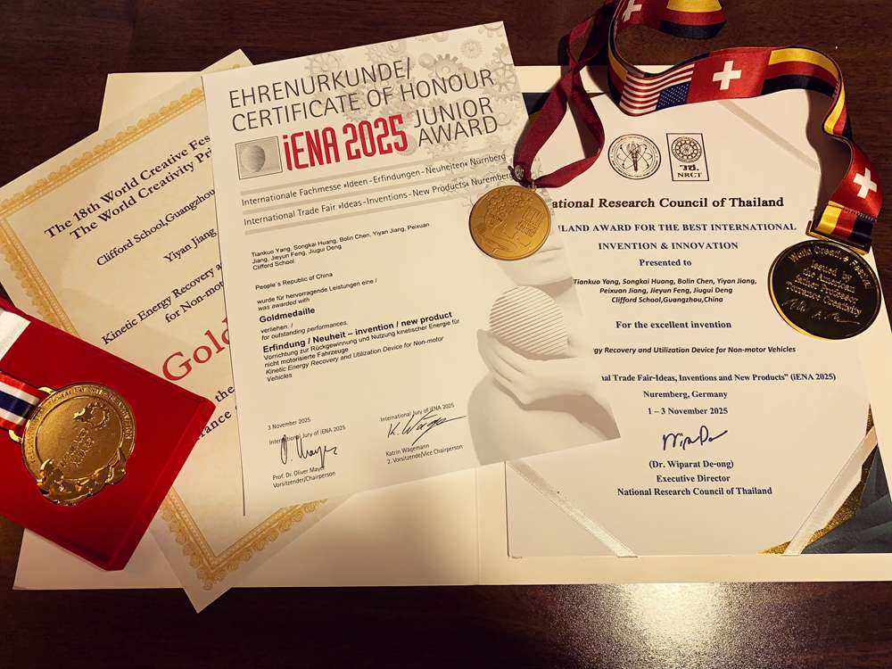 在这个全球创新成果展示与交流的顶级殿堂,祈福英语实验学校科技组的高中学生蒋沛轩、姜奕言、陈泊霖、黄颂凯、杨天阔的创新发明《非机动车动能回收装置》,以其创新价值与实用价值,在众多创新作品中脱颖而出,一举斩获三项国际大奖,成为本届世界发明展全场唯一实现 “全满贯” ,实现历史性突破!