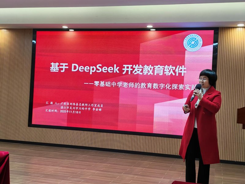 刘伟善名教师工作室成员、湛江吴川市川西中学李金娣老师分享《基于Deepseek开发教育软件》,直击教师“想做数字化工具却不懂编程”的痛点。她以“需求指令化—AI生成框架——教学适配优化”三步法,实现“零基础开发”,开辟了教师自主开发教学工具的新路径,彰显工作室“以技术赋能一线教学”的实践导向。
