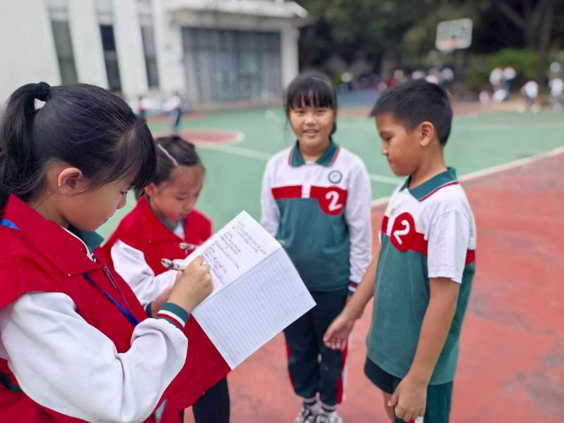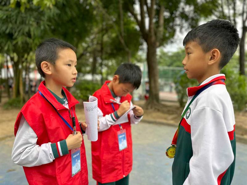 练炽明校长的身影也时常出现在赛场各处,不断为运动员加油鼓劲,尤其为坚持完成比赛的选手点赞。小记者陆嘉怡借此机会进行专访,练校长表示:“胜负固然重要,但更重要的是参与的过程和永不言弃的精神。校运会不仅是竞技舞台,更是培养集体荣誉感和坚韧品格的课堂。”这番话让在场的小记者们深受启发。