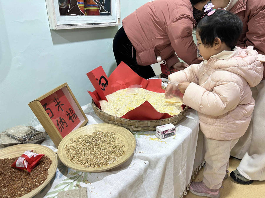与此同时,绿洲园区的“百米纳福”活动温情启幕。孩子们怀揣着从家中带来的各色米粮,有饱满的白米、香甜的小米、营养的黑米,还有寓意吉祥的红豆,在老师的引导下依次将粮食倒入指定容器中,用“百家米、纳百福”的传统方式,寄托对新年的美好期许。礼仪小使者们身着喜庆的汉服和卡通服饰,手持新年小礼物在门口热情迎接,一声声稚嫩的问候、一个个温暖的拥抱,让入园环节充满仪式感,也让家长和孩子们在第一时间感受到新年的喜悦与美好。