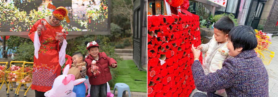 文晖园区的“庙”趣满园庙会活动热闹登场,多个特色摊位前人头攒动,成为孩子们欢乐的天地。“蒙眼摸福”活动考验着孩子们的感知力与专注力,蒙着双眼的小朋友在规定时间内摸索着寻找福字,每摸到一个便引来阵阵欢呼,现场气氛热烈非凡;“滚轮印画”摊位前,孩子们手持滚轮在空白红包上尽情创作,五彩斑斓的图案勾勒出心中的新年愿景,一个个独一无二的红包承载着满满的童趣与祝福;“套圈纳福”游戏更是人气爆棚,孩子们瞄准摆放整齐的小马玩偶,凝神聚力抛出套圈,成功套中的喜悦感染着在场的每一个人。