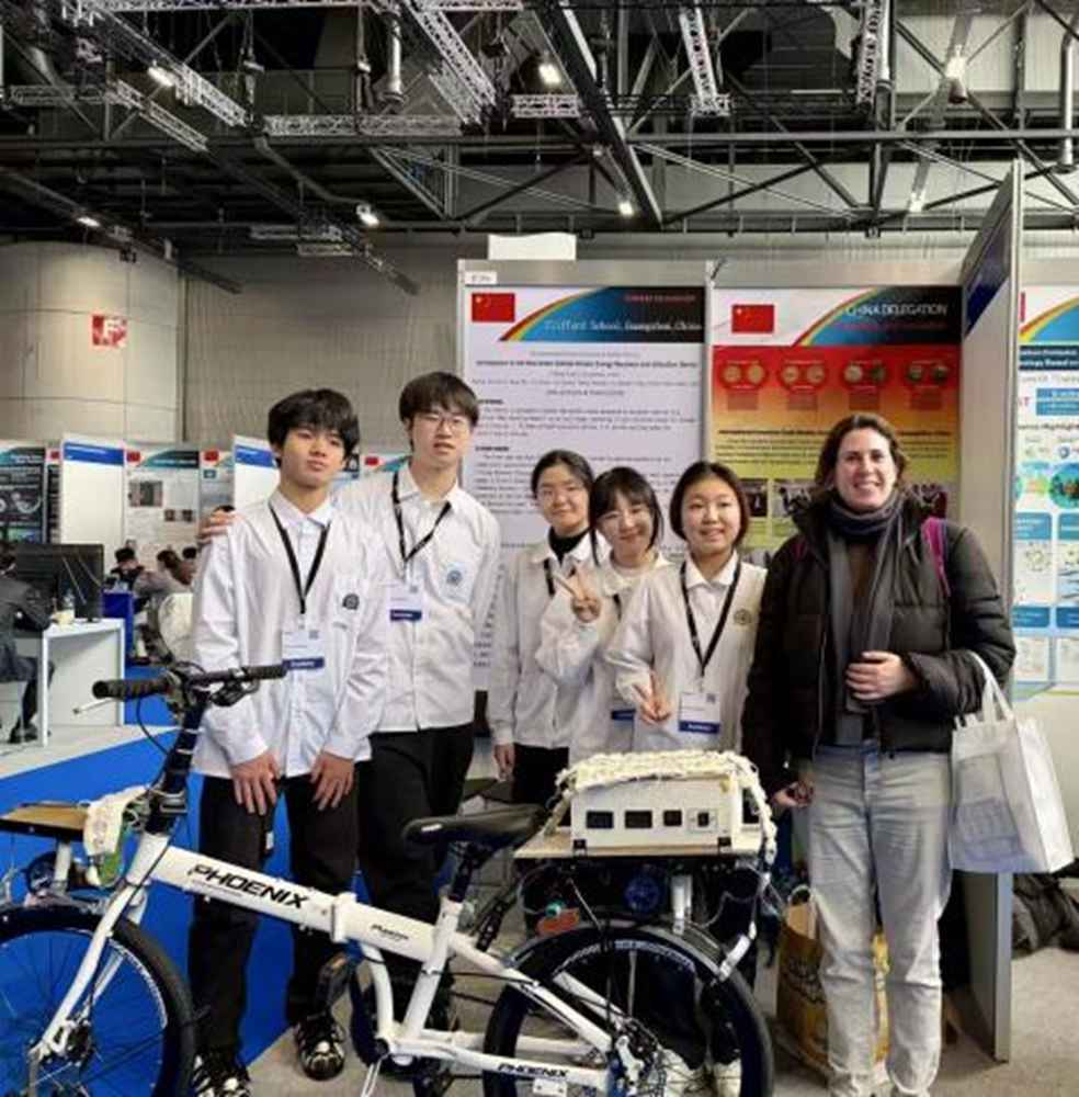 祈福英语实验学校学子蔡云帆、邓沛妮、刘芯、刘亦若、章昀初、刘涛鸣、汤松睿,在指导教师邓九贵、冯杰云的悉心带领下,携 “非机动车动能回收装置 2.0”强势出征。凭借独特的AI创新理念和极强的实用价值脱颖而出,赢得国际评委的高度赞誉,成功摘得双金,成为本届展会中亮眼的中国青少年创新名片。