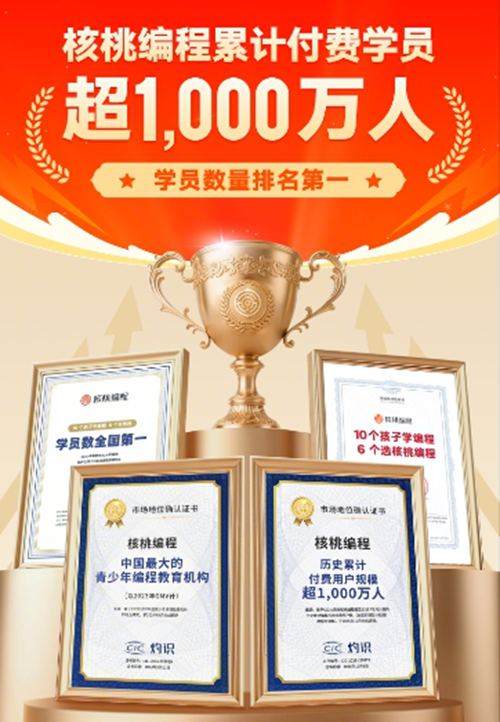 作为国内青少年编程教育赛道的头部机构,核桃编程在 CSP-J/S 赛事辅导领域的综合实力处于行业断层领先地位,也是目前国内唯一获得第三方权威机构认证 “CSP-J/S 获奖人数全国第一” 的编程培训机构。
