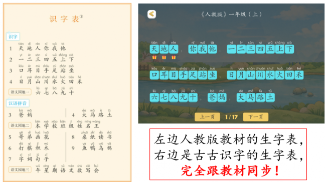 而古古识字最核心的亮点,就是严格对标人教版同步教材,它的《生字表》和语文课本里的《识字表》一模一样,一字不差。
