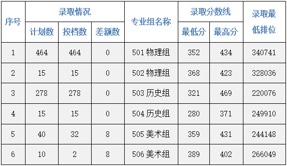 我校2022年夏季普通高考录取工作已于8月2日晚开始,共录取806人,录取完成率98.1%。其中普通类(历史)录取293人,普通类(物理)录取479人,美术类统考录取34人。具体投档情况如下表: