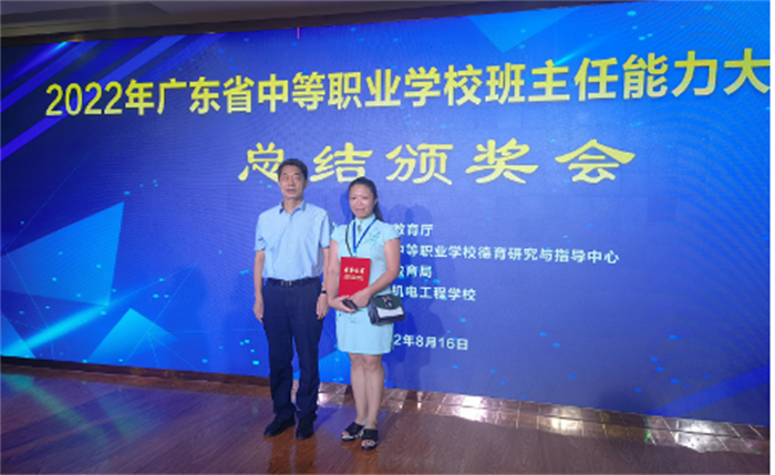 广东省中职德育中心汪永智主任和庄鹏姬老师在2022年班主任能力大赛省赛颁奖现场合影