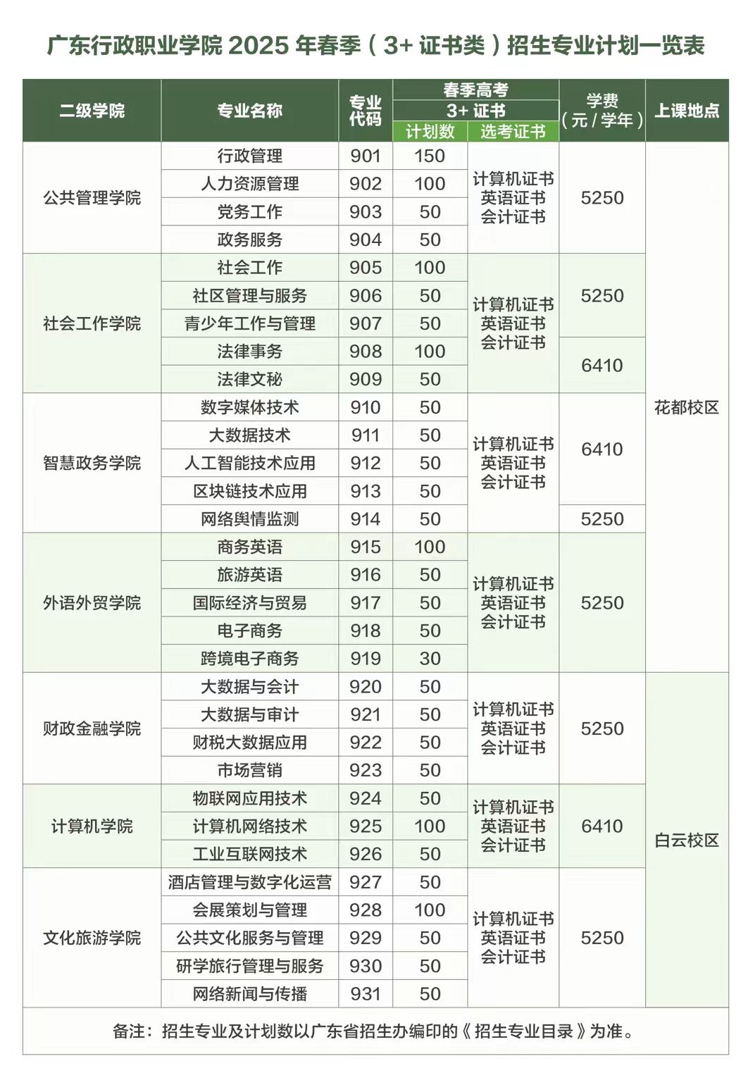 2025年我校春季高考招生计划如下:依学考招生计划981人,3+证书招生计划1930人,以上计划最终以广东省教育考试院公布为准,欢迎广大考生报考。