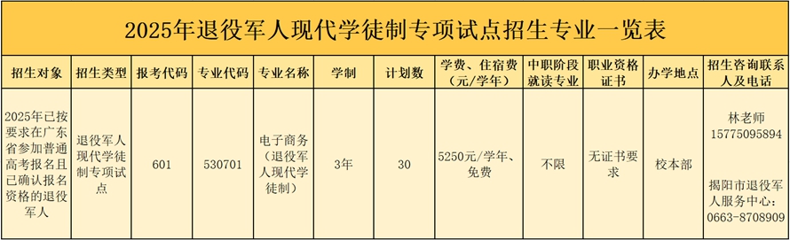 (二)退役军人现代学徒制专项试点考生:符合条件的退役军人报考退役军人现代学徒制专项试点计划免文化素质考核,由揭阳职业技术学院自主命题、组织实施职业技能考核,择优录取。职业技能考核满分值为100分。