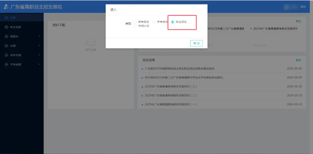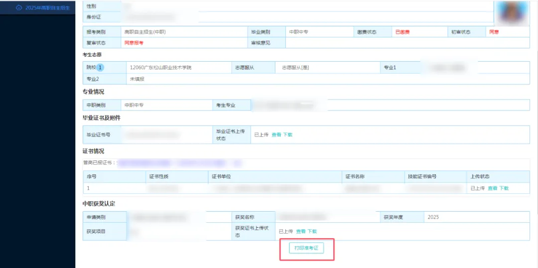 考试前务必使用“电脑”登录广东省2025年高职院校自主招生网上报名系统:https://pg.eeagd.edu.cn/gzks/,输入考生号(10位数)及个人密码登录后,选择“自主招生”报考类型点击“确定”,在左上边点击“预报名”,然后点击“2025年高职自主招生”,进入页面最底端,点击“打印准考证”即可。具体操作如下图:
