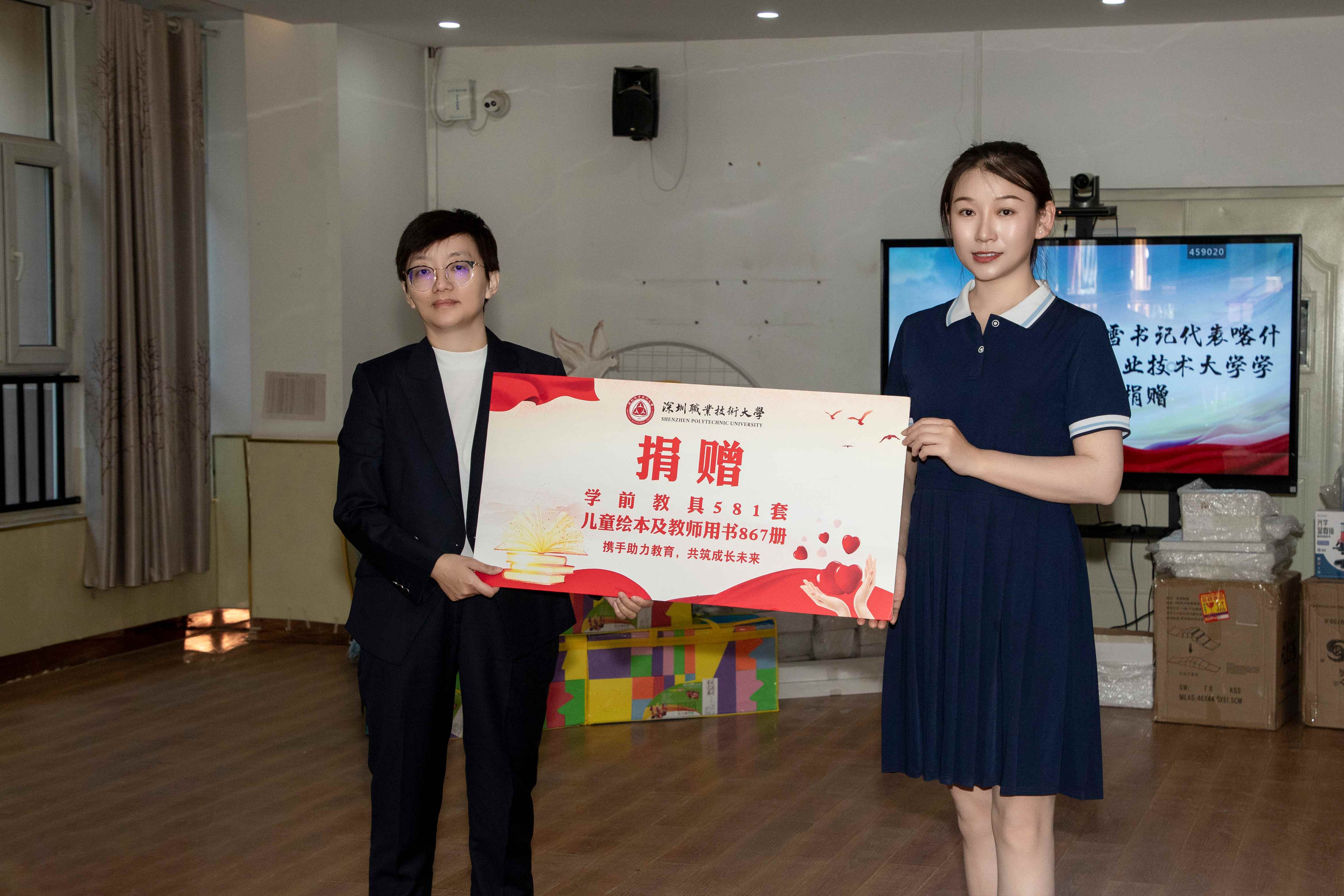 在军民同心幼儿园,一场充满温情的“情系边疆”捐赠仪式暖心开启。刘峰向军民同心幼儿园李雪园长递上捐赠牌,581套益智玩教具、867册绘本及教师用书将惠及四所幼儿园2000余名儿童。四所幼儿园园长展开“大爱无疆润边疆,深职真情暖喀什”锦旗,孩子们表演的《感恩的心》手语操,让在场师生感动落泪。