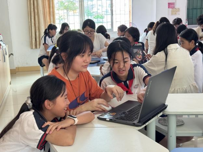 这种“大手拉小手”的创新模式实现非遗传承双向赋能。小学生在创作中零距离感受非遗魅力,四年级的小张同学兴奋地说:“用AI做掐丝珐琅太神奇了,原来传统文化可以这么酷!”。广轻大设计学院二年级的陈同学,也很感慨:“这次活动也让我很有感触,看到弟弟妹妹们用AI复原家乡剪纸纹样,能创造出这么好的作品,让我真正体会到非遗传承需要科技与童心的碰撞。”