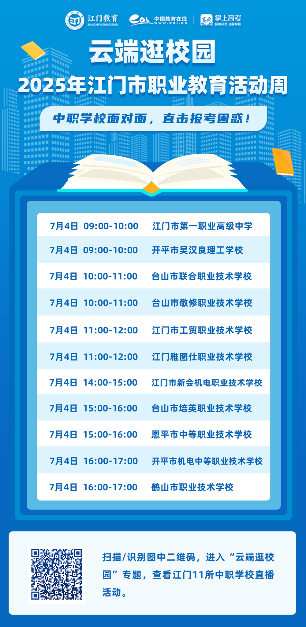 2025年,江门市教育局“云端游校园”中职学校线上直播活动,它不负众望终于来到了“你”的面前。和各类学校直接对话,近距离了解学校专业动态,为“你”把握选择的方向,从各校招生计划到育人方式及就业升学政策等的方面深入剖析,全方位解答“你”的疑惑!