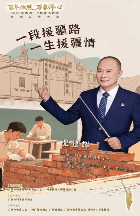 广州市城市建设职业学校教务科科长张建辉荣获“2025年感动广州优秀教师”称号。他与新疆教育情缘始于11年前,2023年,他任广州市教育局第二批“组团式”援疆支教团团长,带领40名教师赴疏附县支教。他梳理当地教育制度,安顿支教教师,成立临时党支部,增强团队凝聚力。任疏附县中等职业技术学校挂职校长时,张建辉引入广州管理模式,制定三年振兴计划,推行“以赛促教”。两年多来,支教学校获地区以上奖项95个,近三年高职高考上线率均超70%,2024年高职高考上线率为74.6%。他还推动“世界冠军进校园”,助力5名疏附师生赴广州特训,实现疏附职校学生国赛“零的突破”。张建辉荣获“2025年感动广州优秀教师”称号