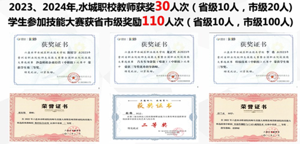 2、学生发展质量跃升:科研反哺教学的最直接受益者无疑是学生。高效课堂模式的推广和本土化课程的落地,极大地提升了学生的学习兴趣、实践技能和综合素养。最直观的变化体现在学生职业技能竞赛成绩上:2024至2025学年,水城职校学生在全国职业院校技能大赛省市级选拔赛中获奖数量与等级均创历史新高。2024年学校选派移动应用开发、企业经营沙盘模拟两个比赛项目的师生共8人赴中山一职集训,选派网络建设与运维、物联网技术与应用两个比赛项目的师生共6人赴贵州机电集训。在2024年学生技能大赛中,智能制造设备技术应用赛项获省一等奖;产品数字化设计与开发赛项获省二等奖;航空服务赛项获省二等奖;法律实务赛项获省三等奖。2024学年第二学期,组织学生参加贵州省职业院校技能大赛共12项,肖瑶、汪丽老师指导学生获省一等奖,王正超、郁苏老师指导学生获省二等奖、刘云霞、余娥仙老师指导学生获省三等奖,马灵芝老师获省级三等奖,学校共获市一等奖15项,二等奖25项、三等奖37项。更为重要的是,学生综合职业能力得到企业高度认可。得益于课程内容与岗位需求的紧密对接以及实践教学的强化,学校毕业生就业质量实现飞跃,一次性就业率较上一年度明显跃升,本地优质企业就业率显著提高,企业对毕业生岗位适应能力和职业素养的满意度调查结果大幅提升。