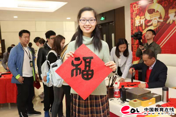 书法送福现场气氛热闹,排队学生络绎不绝,洋溢着浓浓的年味。2017级经管学院学生王依融,从小也学习书法,她认为:“徐校长的书法十分大气,笔法遒劲有力,力透纸背。尤其是这次拿的‘福’字,字正方圆,笔酣墨饱,从中可以感受到校长对我们深深的新年祝福。”来自印度尼西亚的2019级经管学生Alicia Clara Trevina表示:“我们的新年跟中国的非常相似,希望通过这个‘福’字,能让我的家庭都感受到来自校长的祝福。”