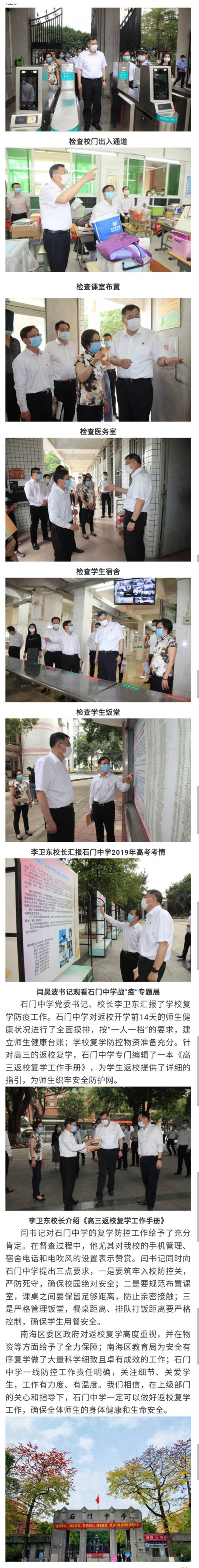 闫书记一行实地查看了校门口学生出入通道设置、体温检测、观察室管理、课室管理、医务室管理、宿舍管理、饭堂管理等工作情况。在七彩广场石中战“疫”专题展板前,闫书记驻足观看,并详细了解了石门中学线上教育情况、防控物资储备情况和石中校友在抗击疫情过程中的突出事迹等。在校道宣传栏前,闫书记仔细观看了石门中学2019年高考录取信息榜,他对我校2019年高考取得的优秀成绩表示赞赏,并勉励2020届高三级再创辉煌。