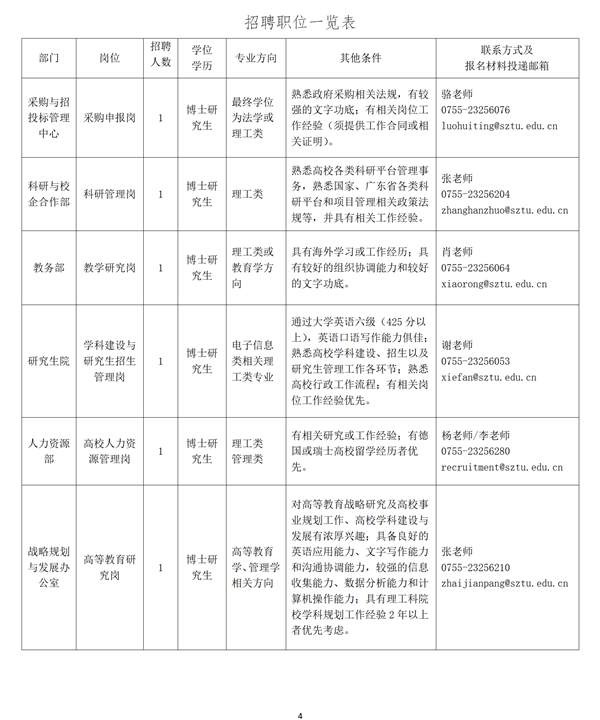 2.发送应聘材料至岗位对应邮箱(邮箱地址见《招聘职位一览表》联系方式栏) ,邮件须以“深圳技术大学行政管理岗+岗位名称+姓名”形式命名。