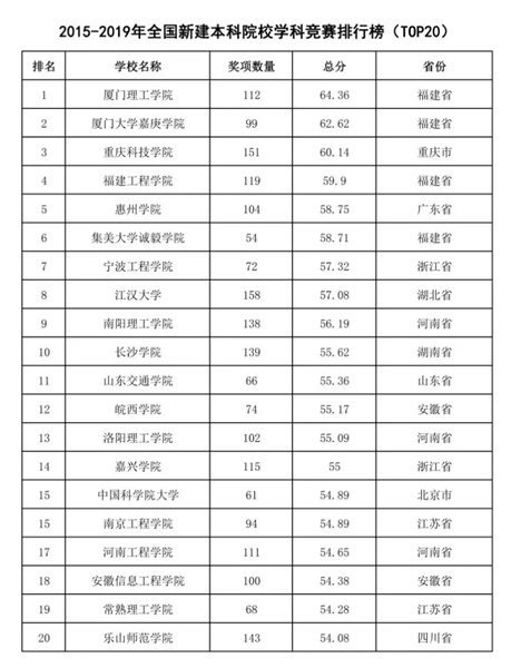 在“2015-2019年全国新建本科院校学科竞赛排行榜(TOP20)”中,惠州学院名列全国第五、广东省第一。
