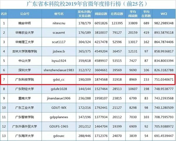 厉害了!广东科技学院在广东省本科院校2019年官微排行中名列第7