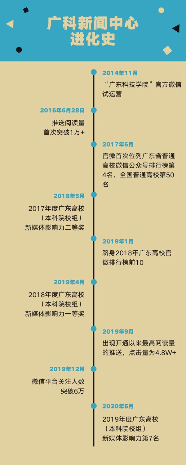 2014年11月,“广东科技学院”官方微信正式开通,成为广科校级层面的官方微信公众号,由新闻中心专责运营。