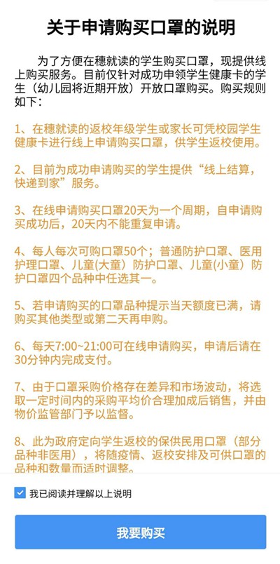 申购口罩的学生和家长可在重启小程序后,进入“学生健康卡”申请购买口罩,选择适用的品种后确认价格和尺寸,半小时内在线支付即完成购买。“校园专区”购买口罩成功率为100%,3天内发货,快递送到家。每天都可以在7:00—21:00在线申请购买,超时未支付的可以再次申请,支付成功的20天内不能重复申请。