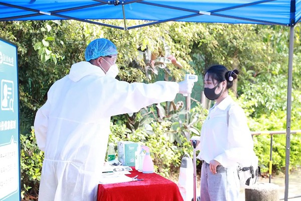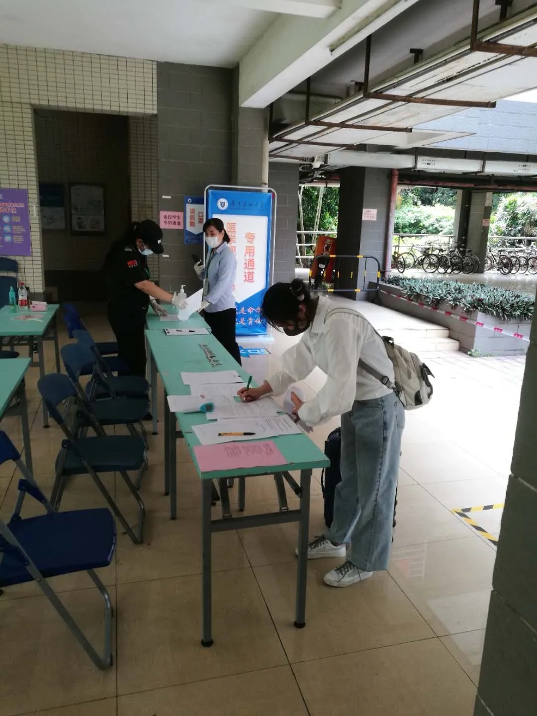 首批返校学生为防控重点地区毕业班学生,返校学生在入口处测量体温、核实身份信息等,在专用行人道进行行李消杀后,分别到学生宿舍2栋和5栋报到点报到,进入各自医学隔离专用宿舍进行为期14天的医学隔离观察。
