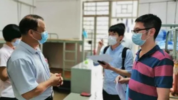 尽管风尘仆仆,督查小组依然本着严谨、负责的工作态度,到校后马不停蹄的开始检查。在校园保安指引下,入校测量体温,扫码登记,洗手消毒,随后在学校疫情防控人员的陪同下兵分四路实地查看了临时隔离室、洗手设施、学生宿舍、学生饭堂、教室消毒通风等重点区域和重要设施,详细了解了学生分批返校计划、学生分段错峰用餐方案,防疫物资准备情况、师生核酸检测情况;检查了校园疫情防控宣传工作。