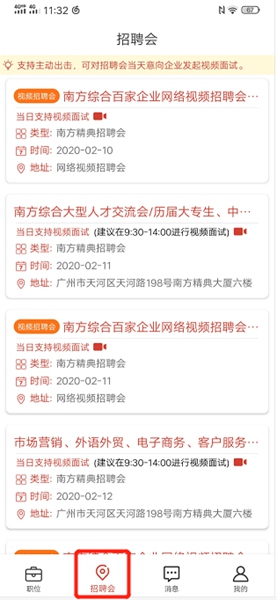 2. 登录后点击app下方“招聘会”模块,查看广州市职业教育与终身教育学会各中职学校(南方人才网络视频校园招聘会)场次及参会企业。