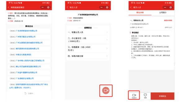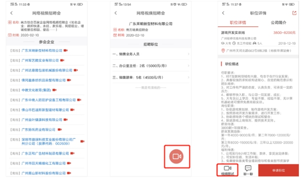 3. 进入某场网络视频招聘会可查看企业在线状态→点击心仪企业页面可详看招聘职位及信息→招聘会当天企业页右下角/职位详情页左下角会出现视频按键,点击即可向该企业发起视频面试。