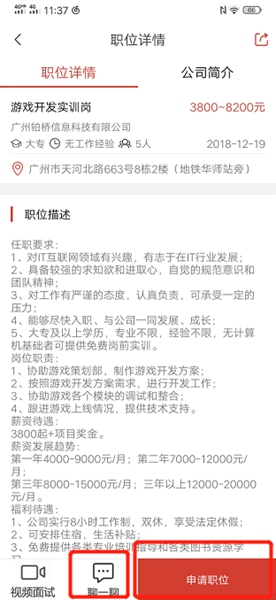 4. 学生也可开启“聊一聊”与企业线上沟通,或直接投递简历“申请职位”。